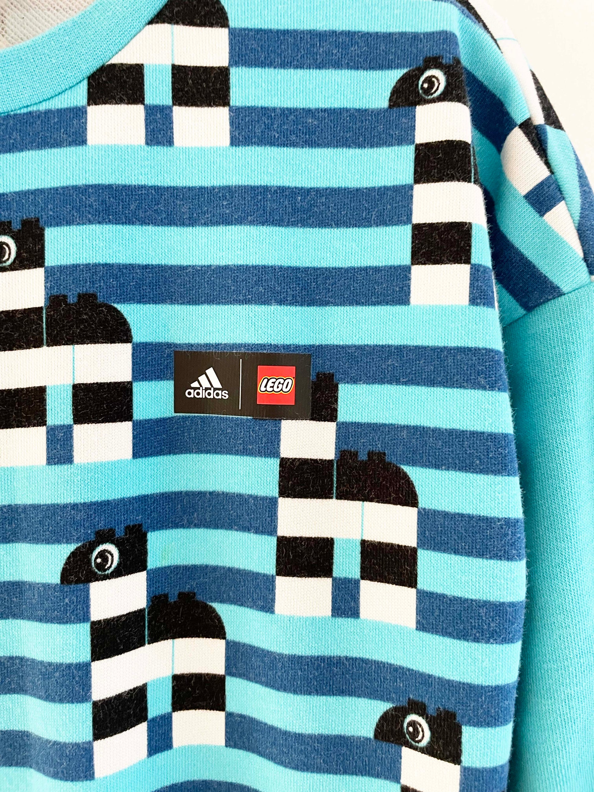 Adidas x Lego collab long sleeve and pant onesie pajama. Features snap button closure along inseam.