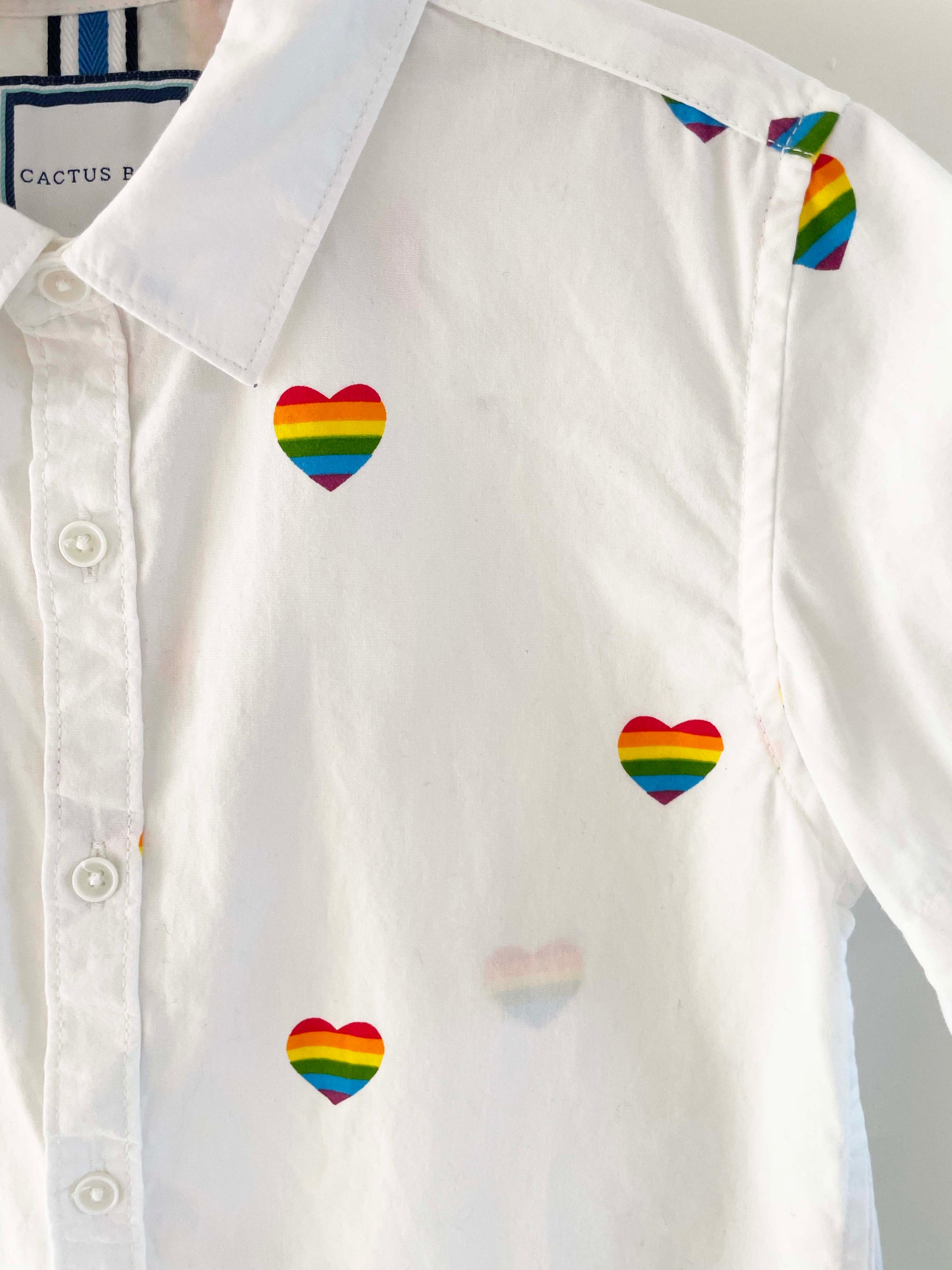 Assorted Brands button down short sleeve collared shirt w/ rainbow heart graphic.