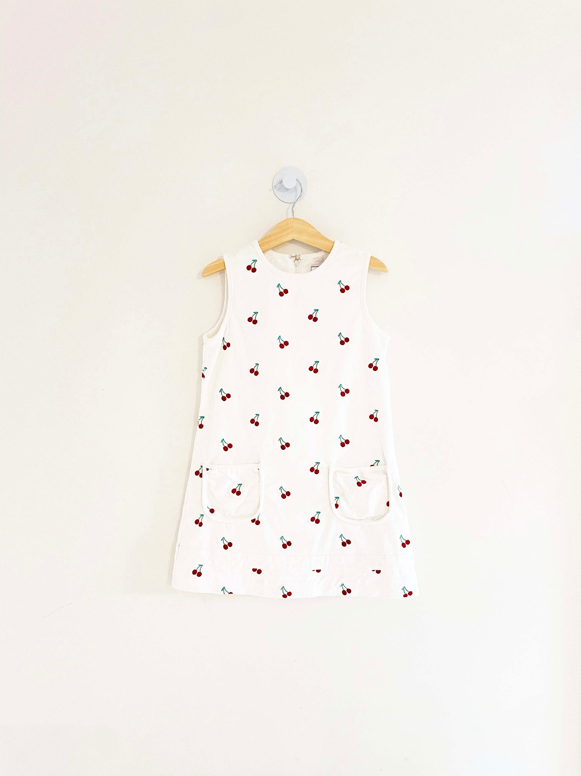 Assorted Brands corduroy dress featuring front pockets and embroidered cherries.
