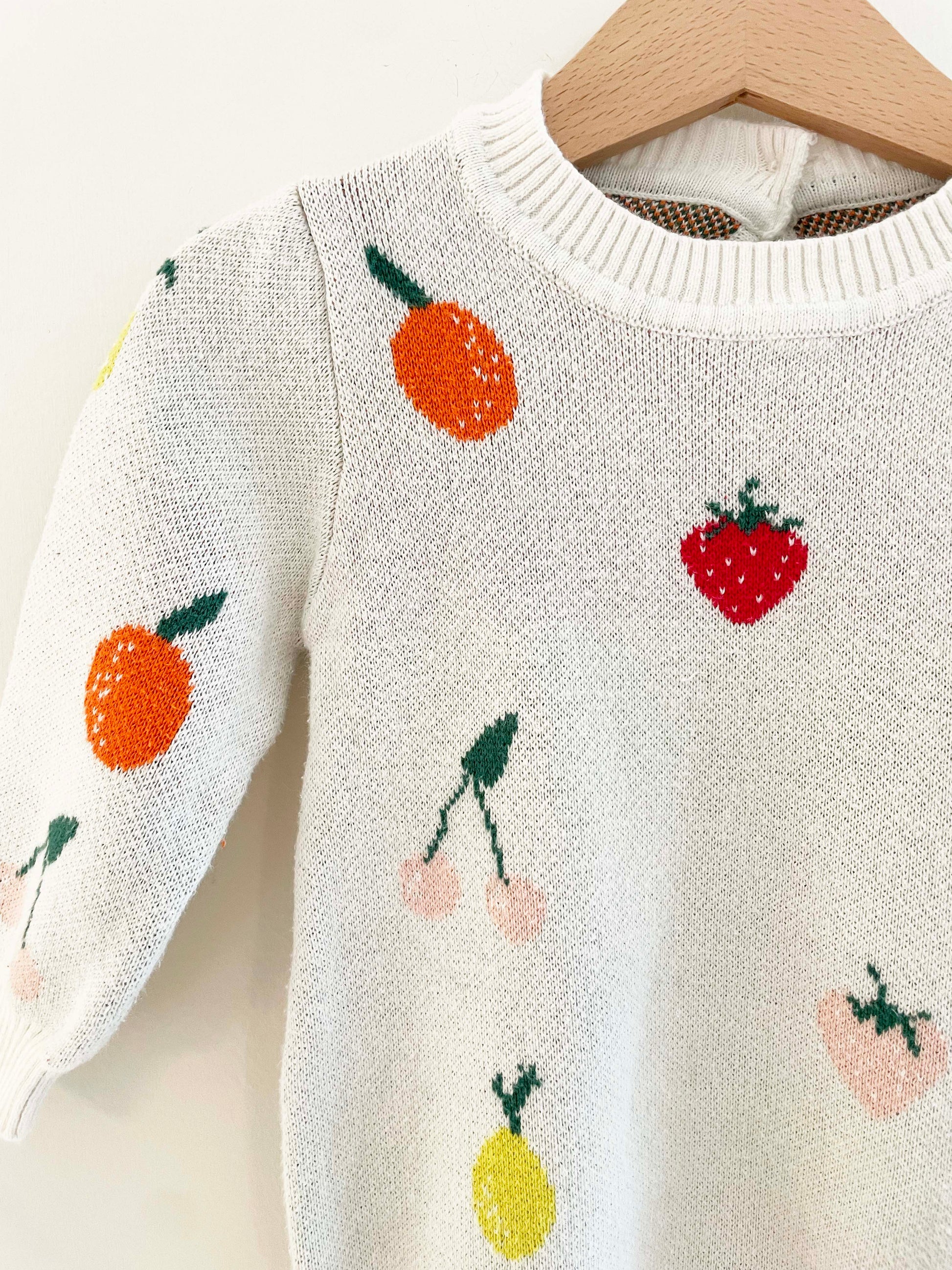 Assorted brands sweater onesie with graphic fruit print. Features button closure on bottom.