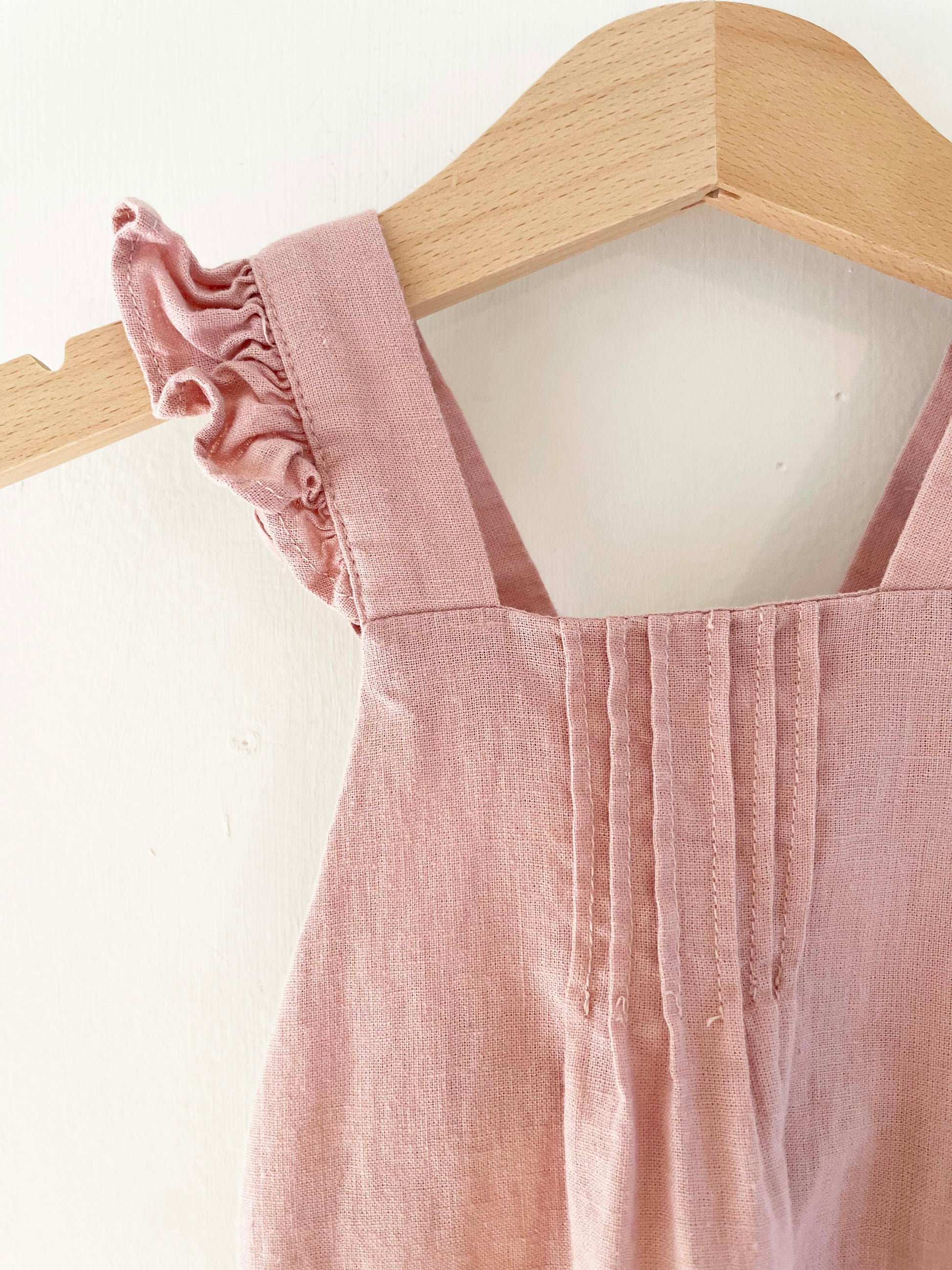 Assorted brands linen onesie w/ ruffle straps and button closure on bottom.