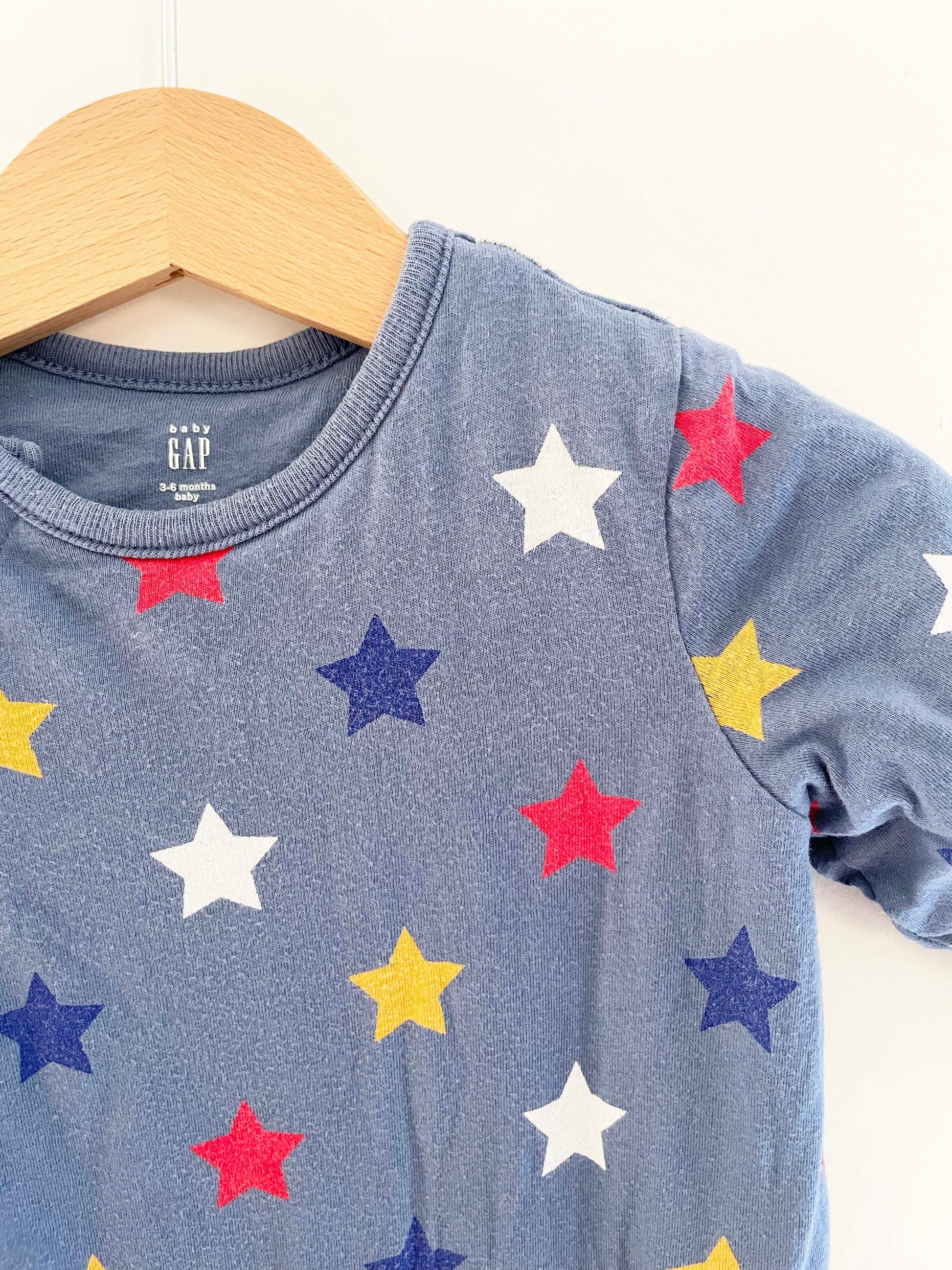 Baby Gap long sleeve and pant, soft coverall. Features a multi colored star print and snap button closure from neck to ankle.