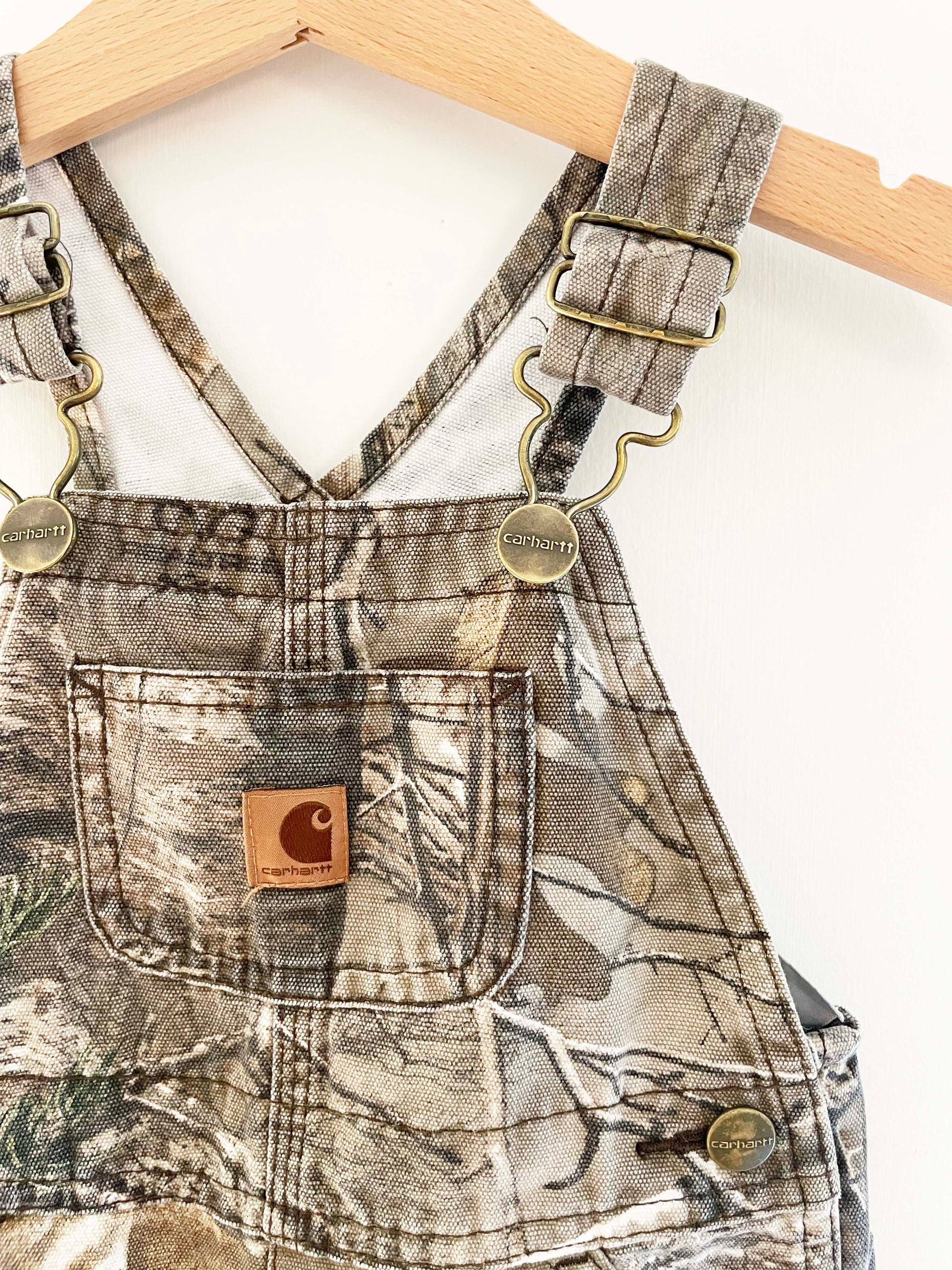 Carhartt x Realtree camo overall. Features a camo print and reinforced knees. Snap closure along inseam.