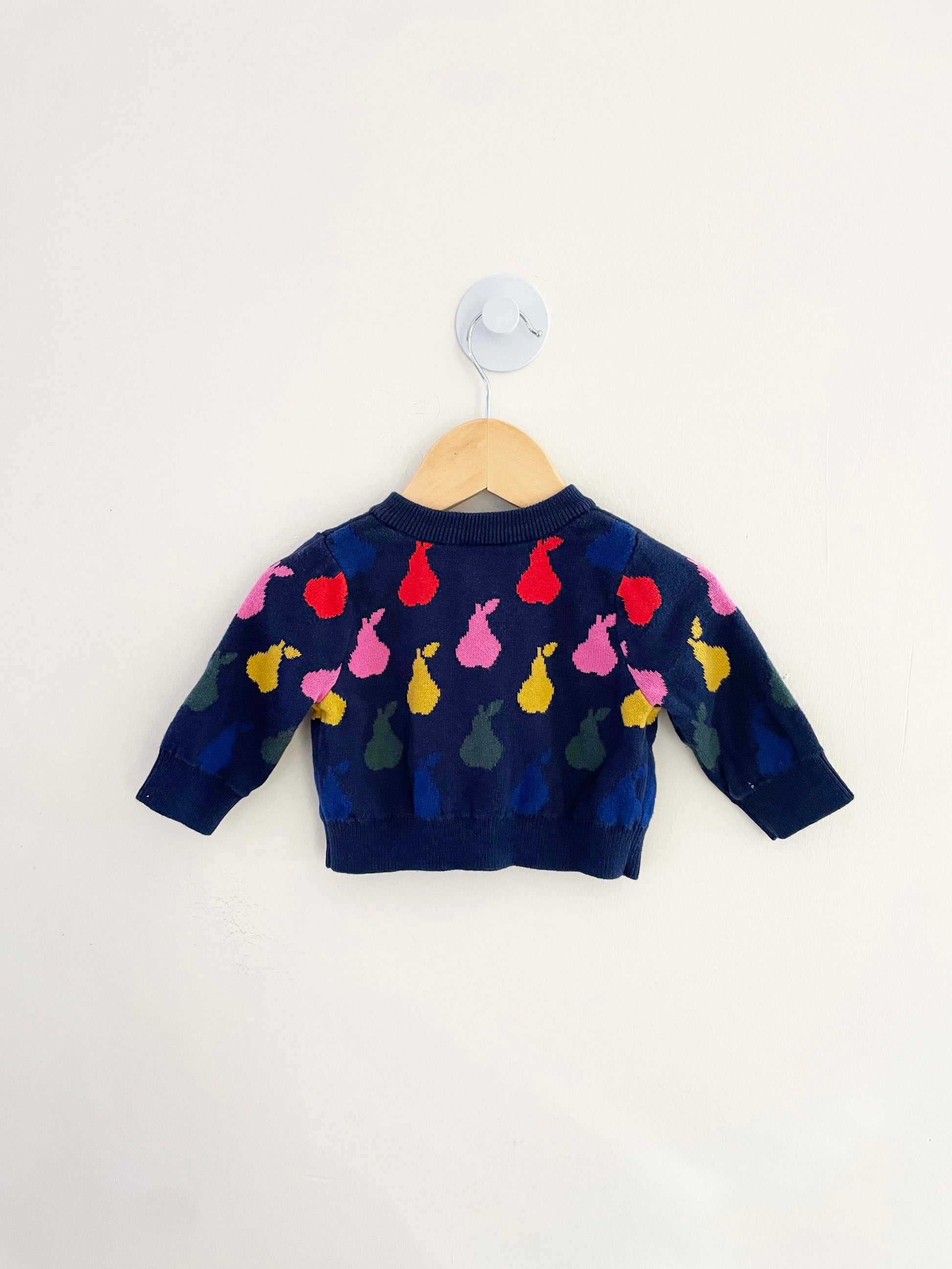 Hanna Andersson knit cardigan with buttons along front featuring pear graphic.