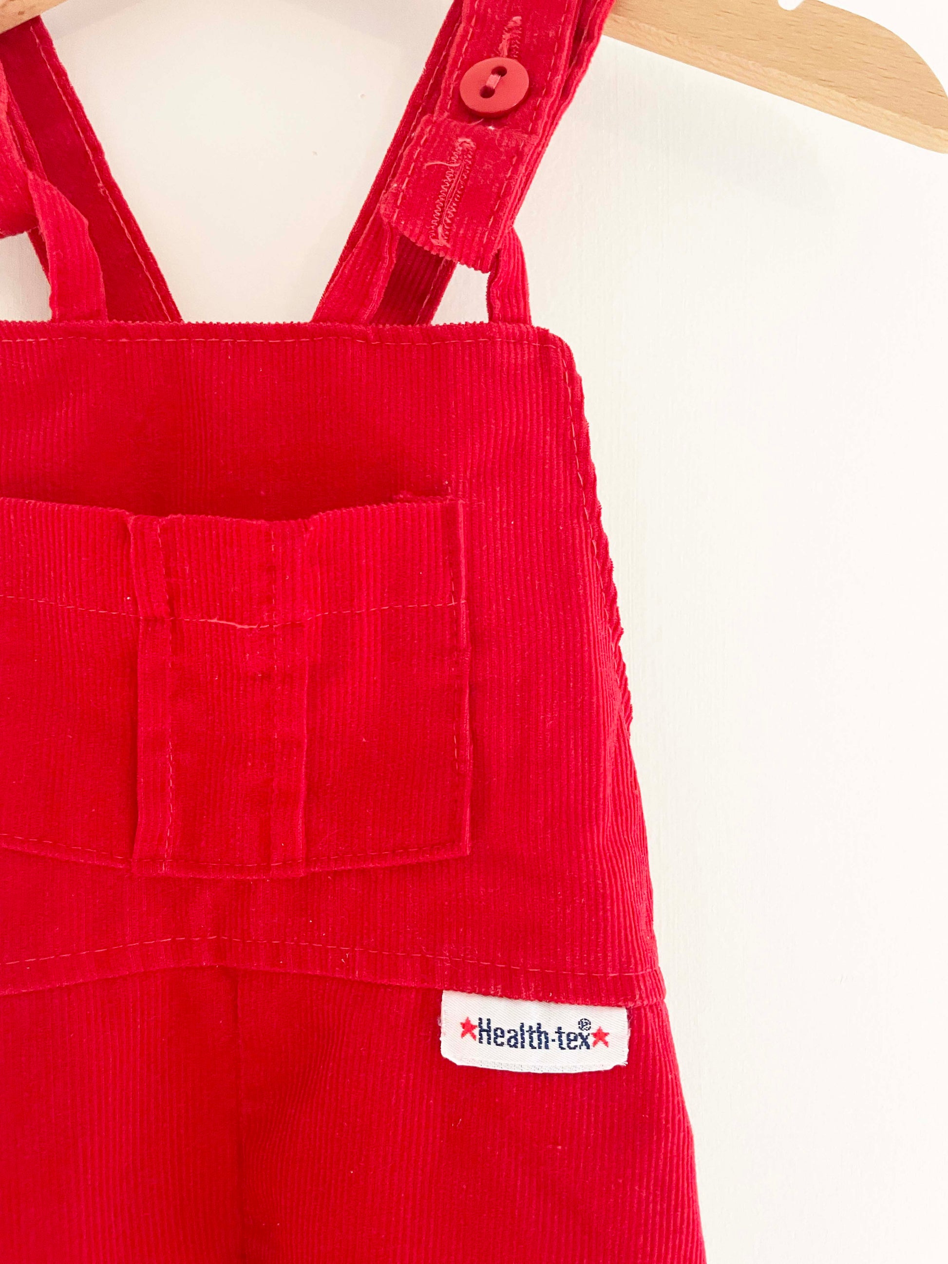 Healthtex red corduroy overall w/ hook and loop shoulder closure, and snap button closure along inseam. Features criss cross straps on back with cinched / elastic waist.