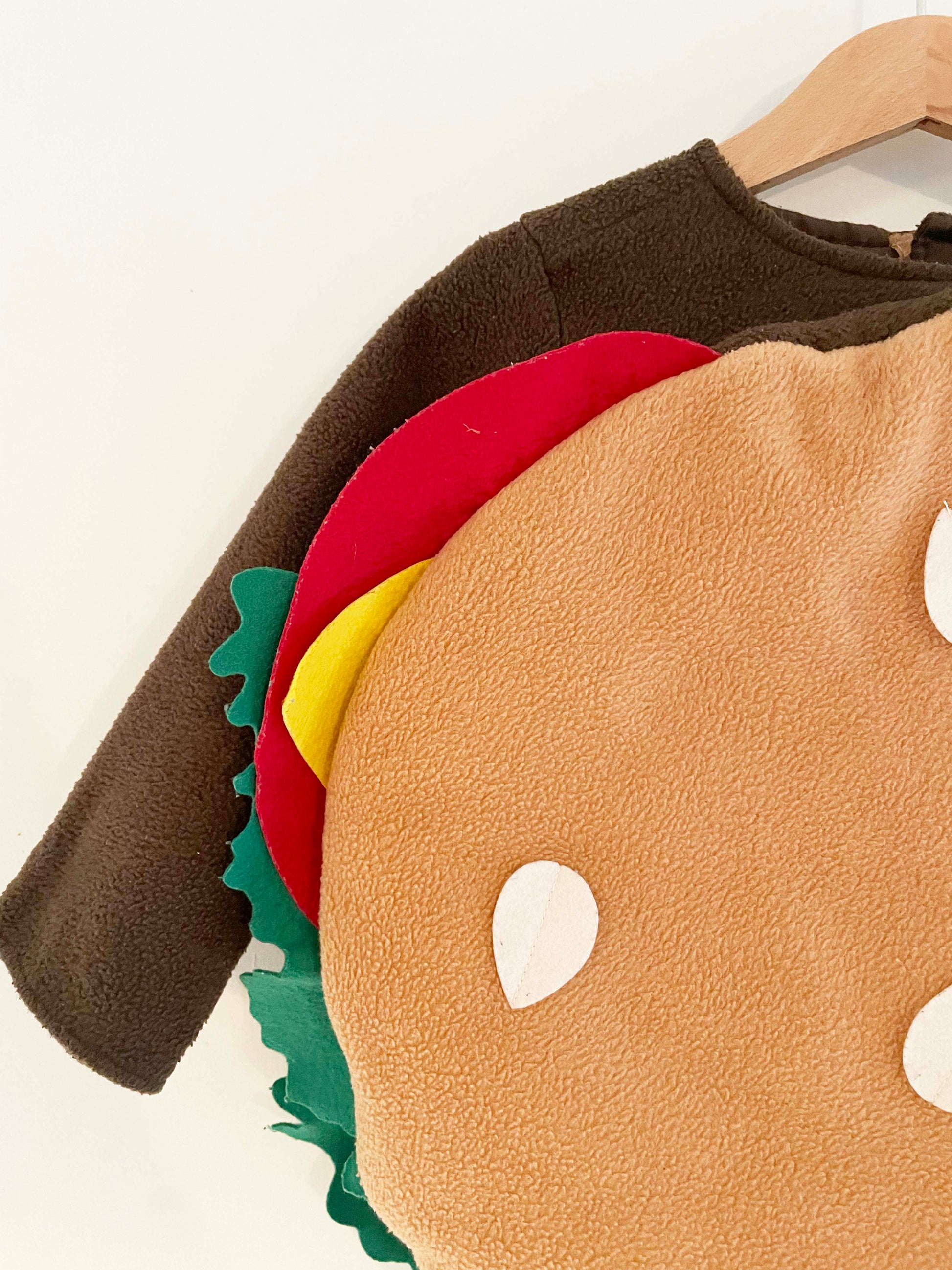Old Navy cheeseburger costume with long sleeve and velcro closure along back. Fleece outer and super warm.