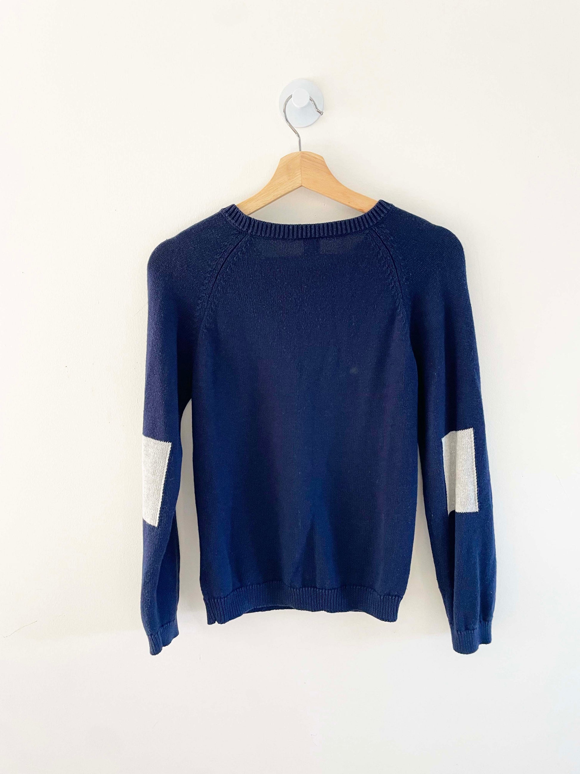 Petit Bateau wool sweater w/ front center pocket and embroidered logo. Long sleeves feature elbow patch detail.