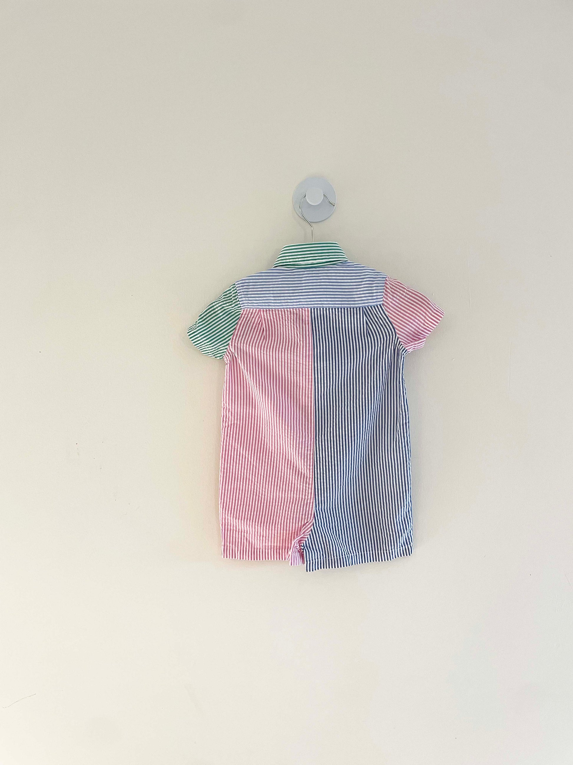 Ralph Lauren striped romper with collar and short sleeves. Features snap button closure along inseam.