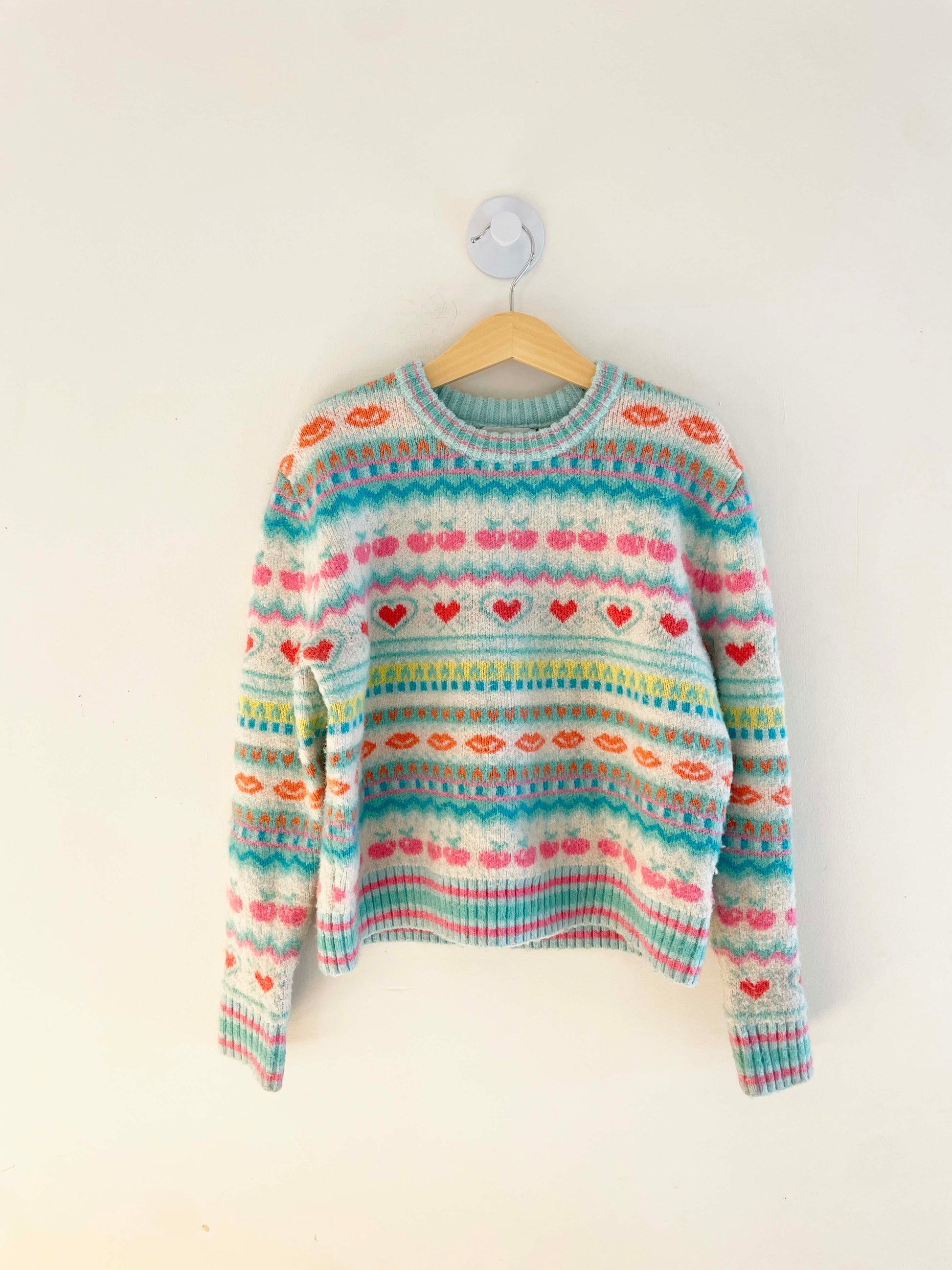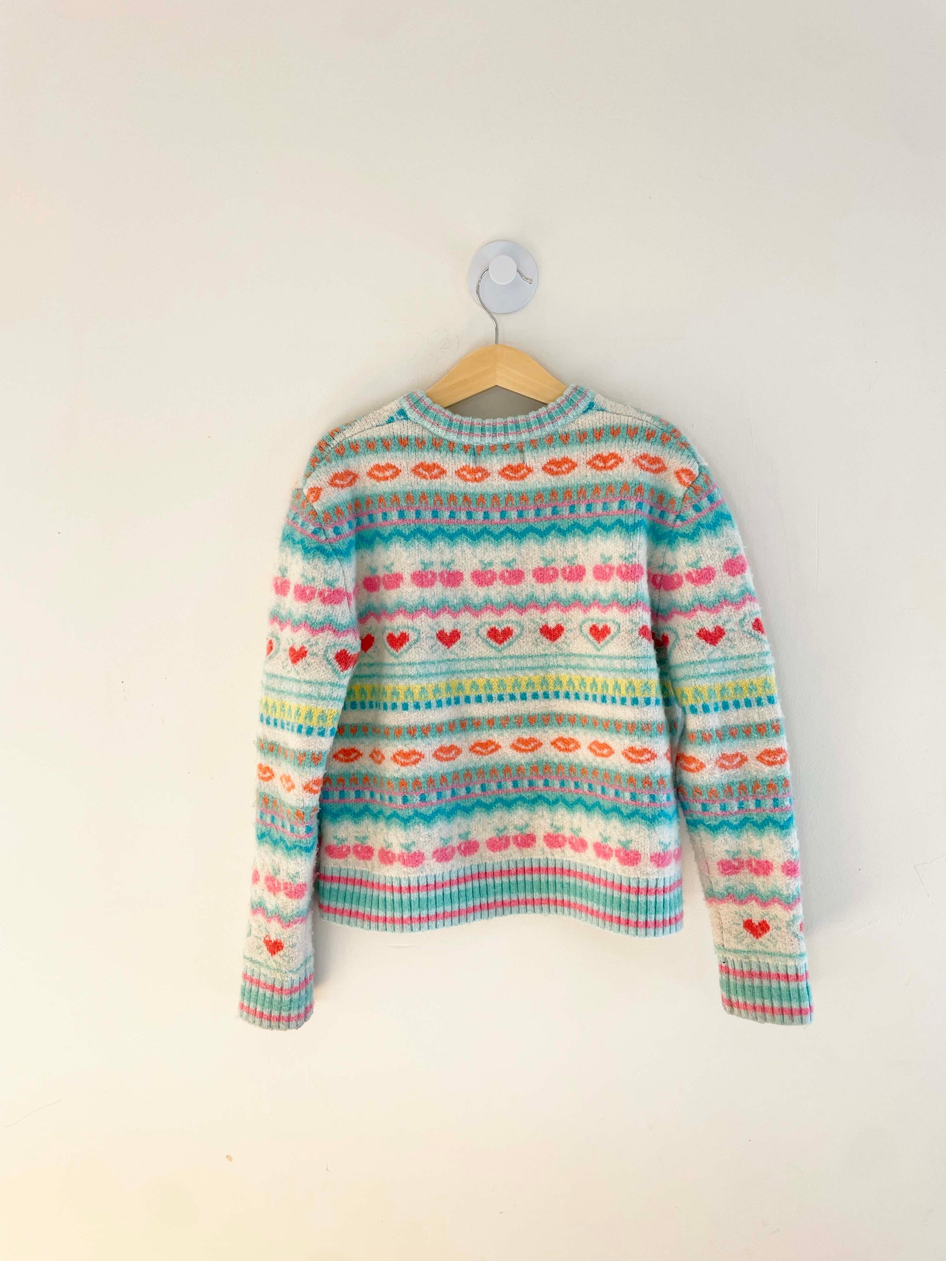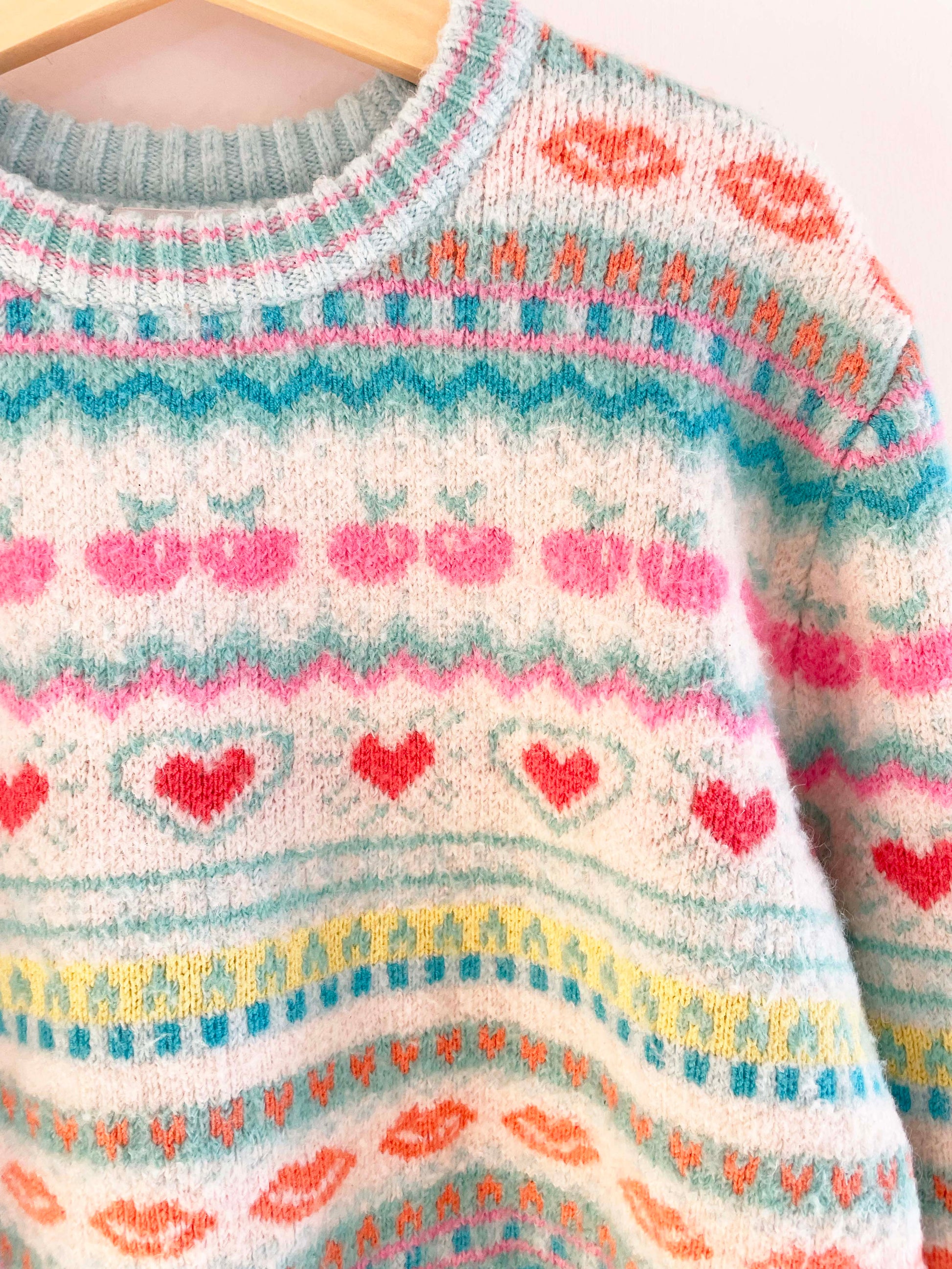 Rockets of Awesome fair isle sweater featuring cherries, hearts, and lips.