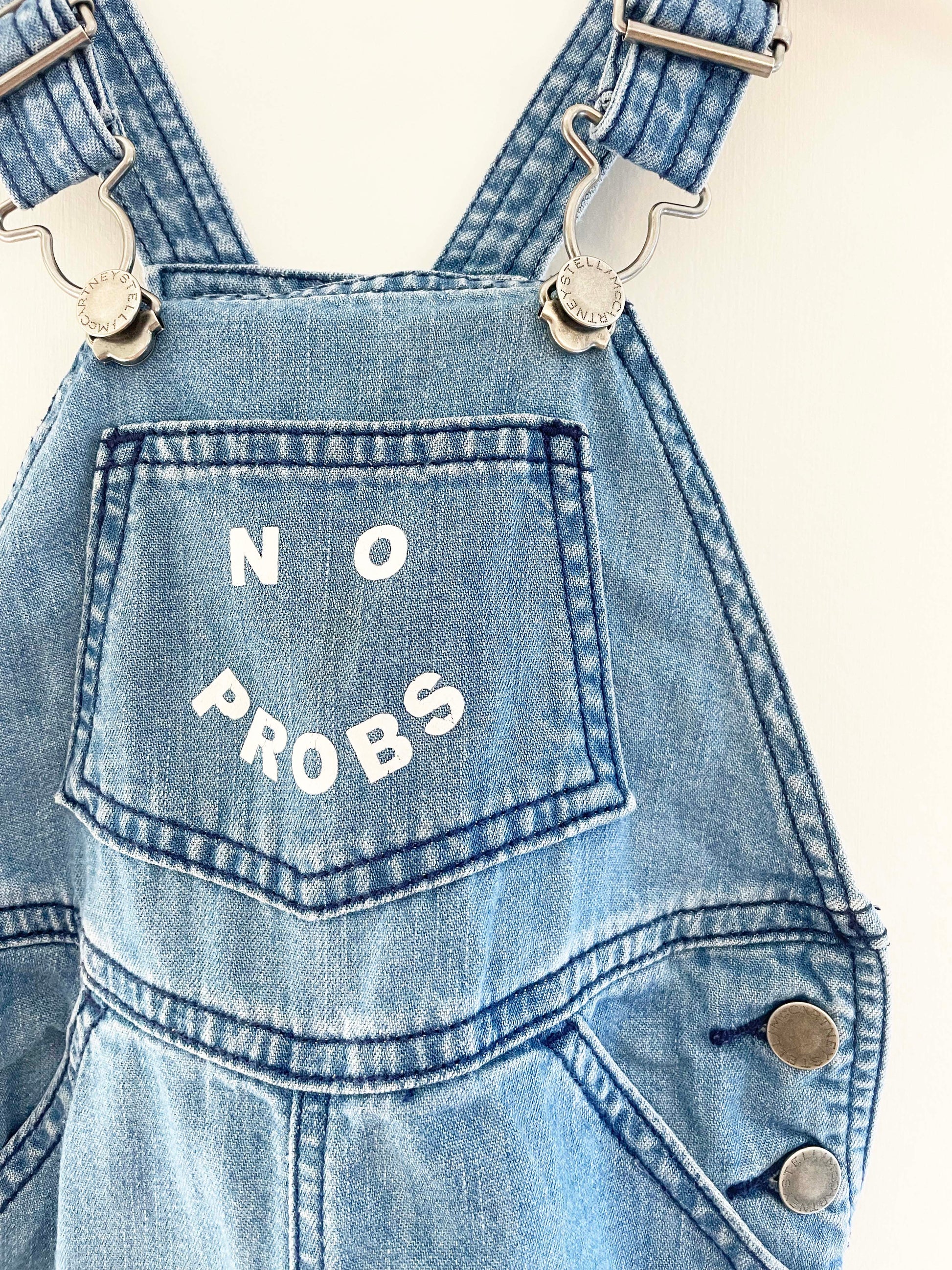 Stella McCartney Kids denim overalls. Features printed text "NO PROBS" and embroidered monsters at knees.