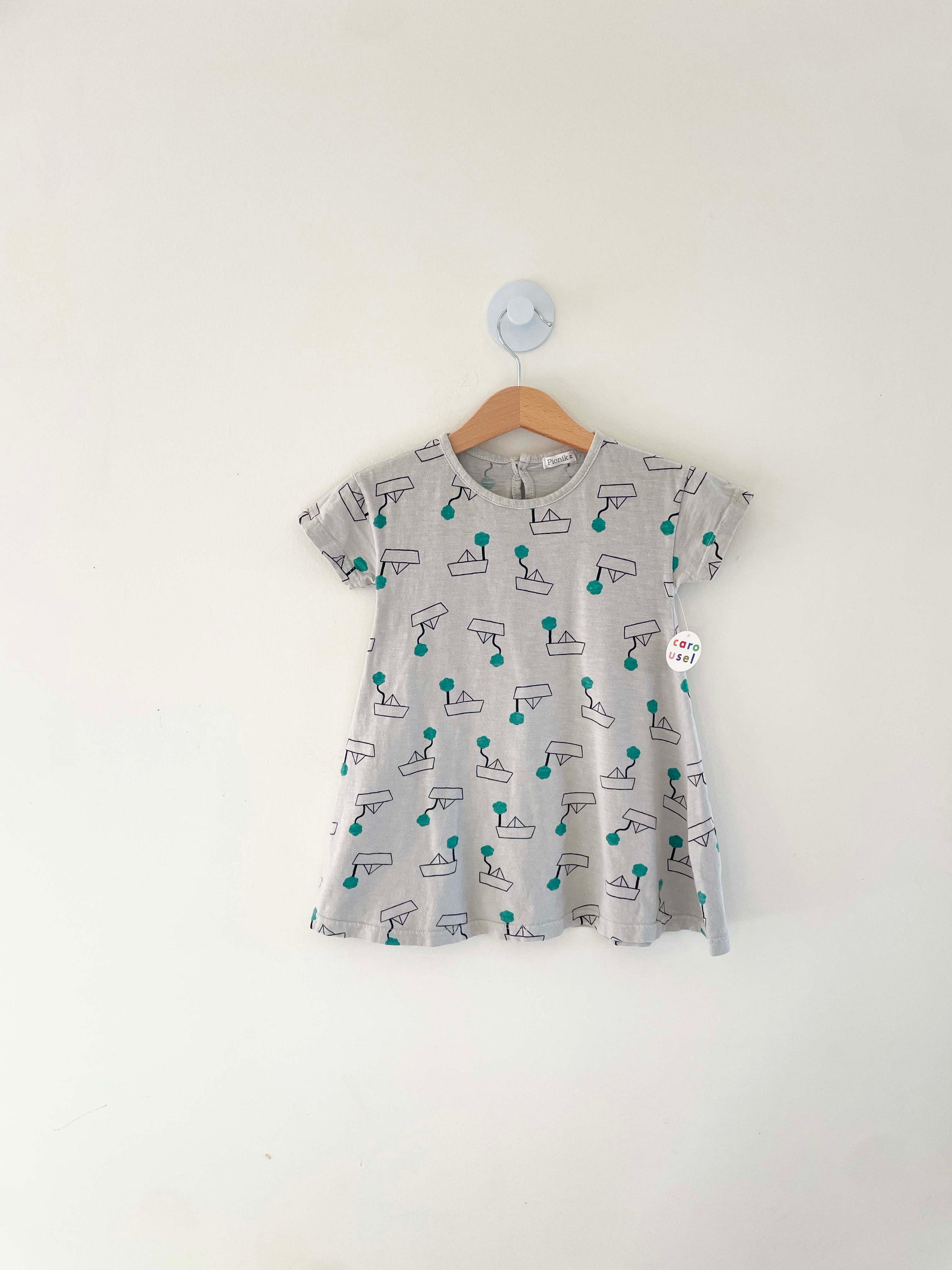 Assorted Brands dress with origami sailboat graphic.