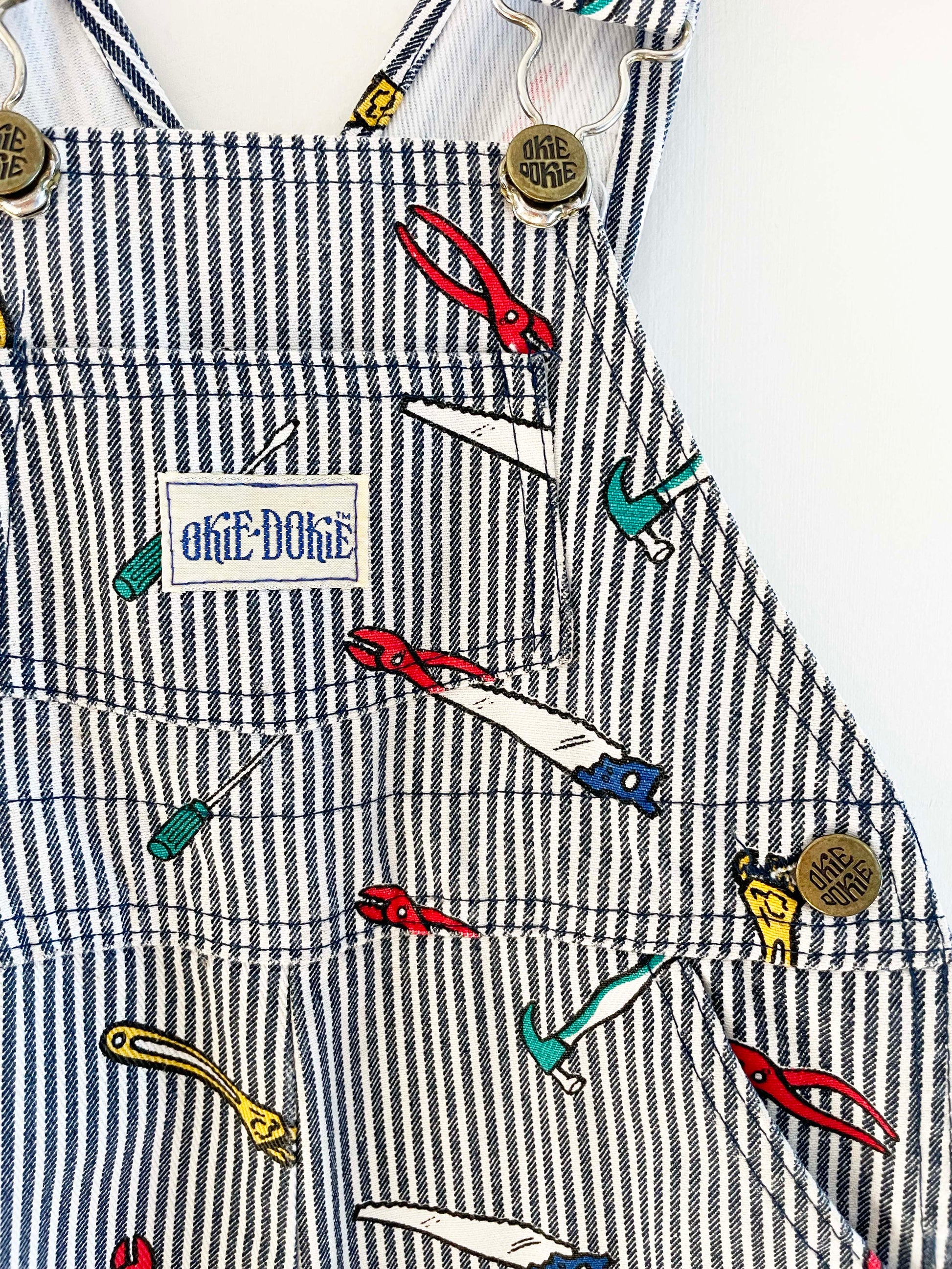 Vintage Okie Dokie striped overall w/ all over tool print.